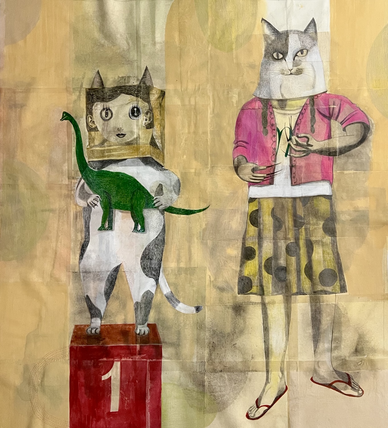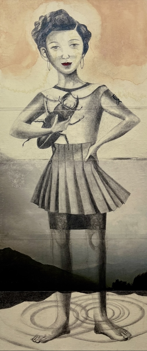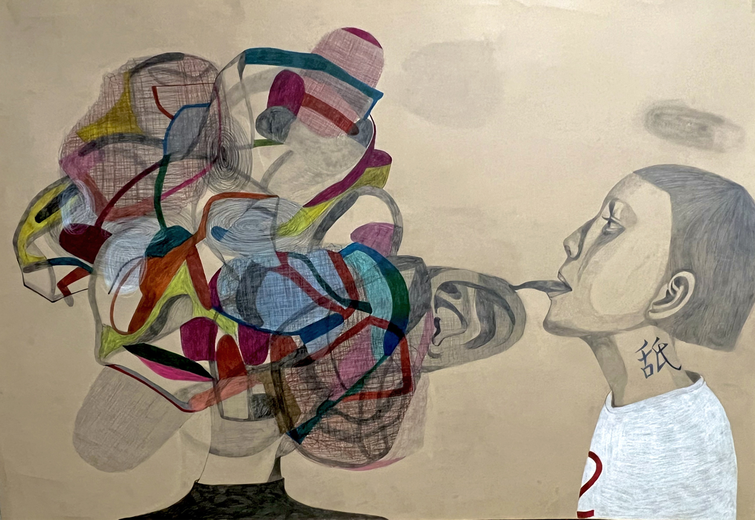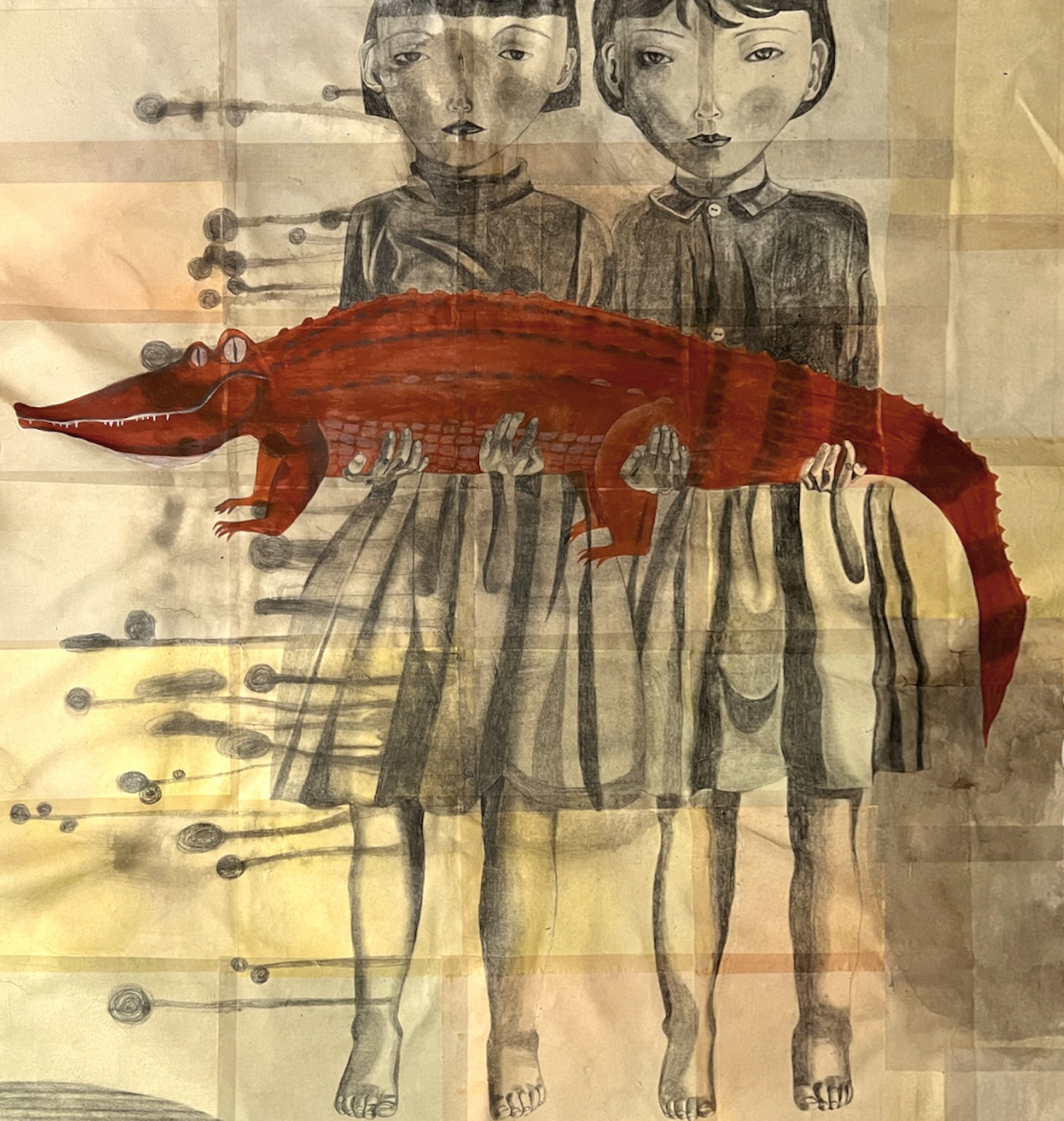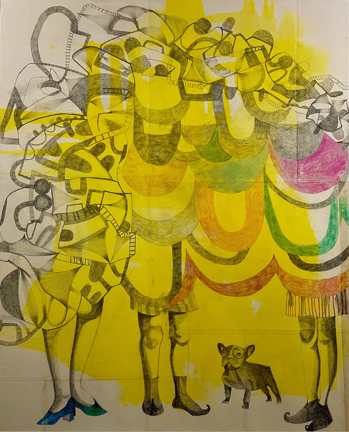 Graphite pencil, colored pencil, charcoal, acrylic and paper on canvas