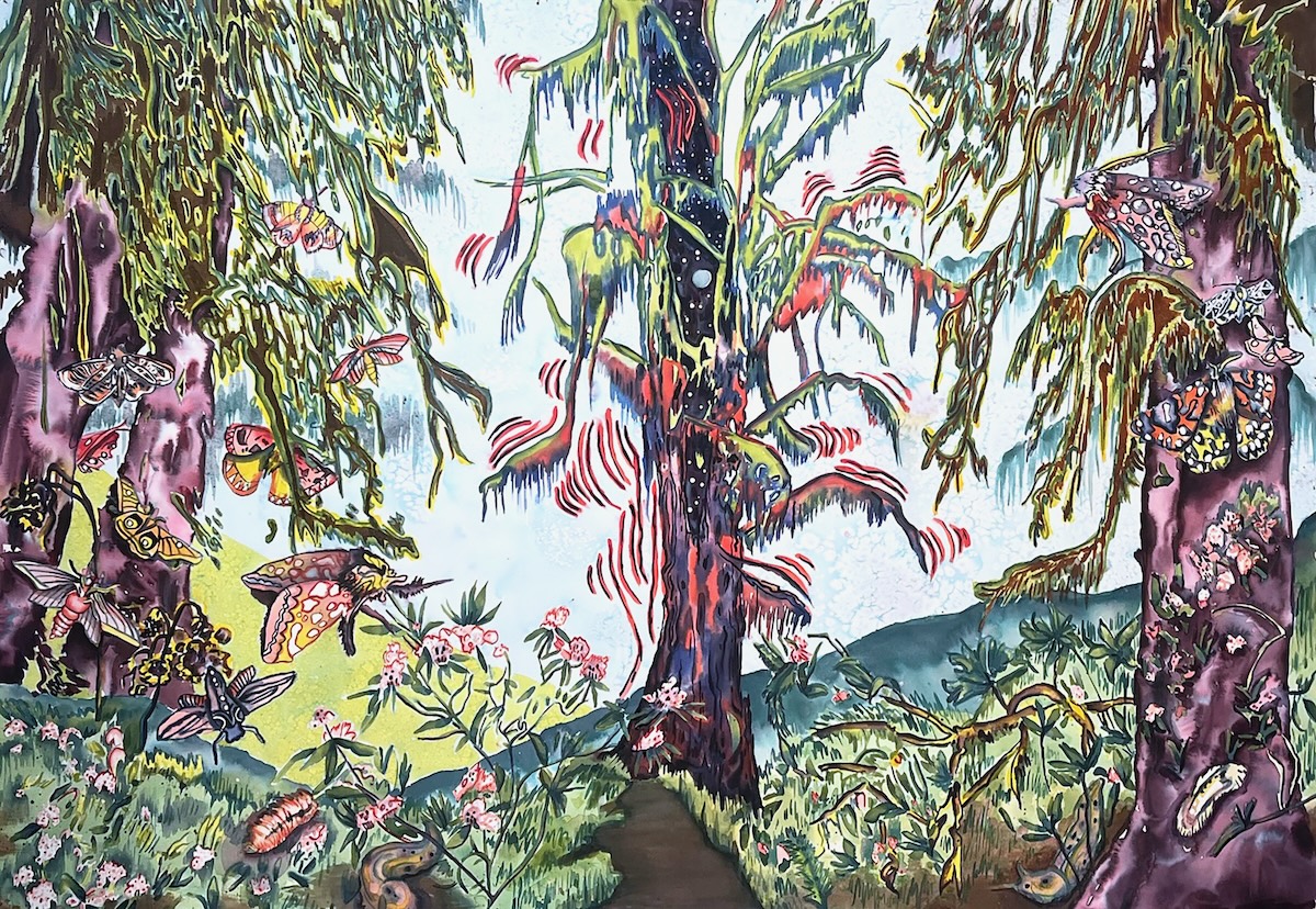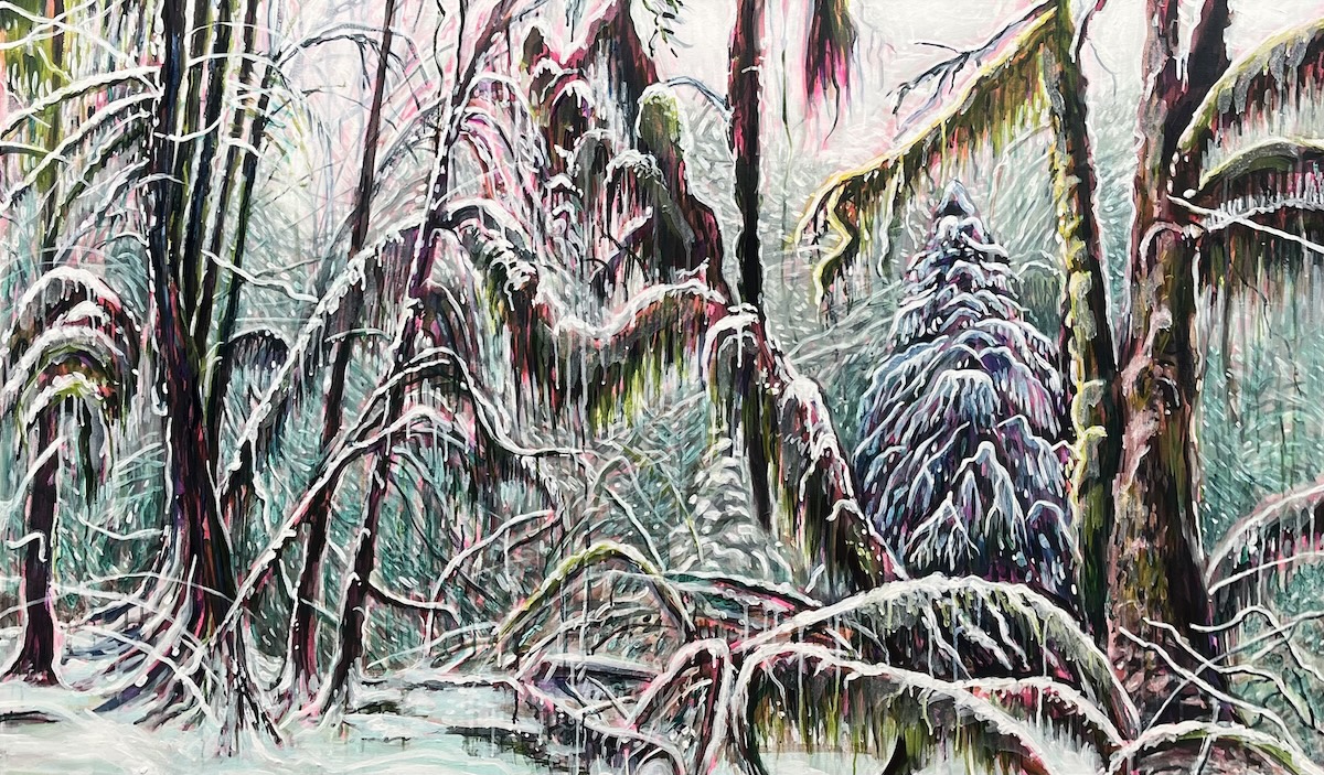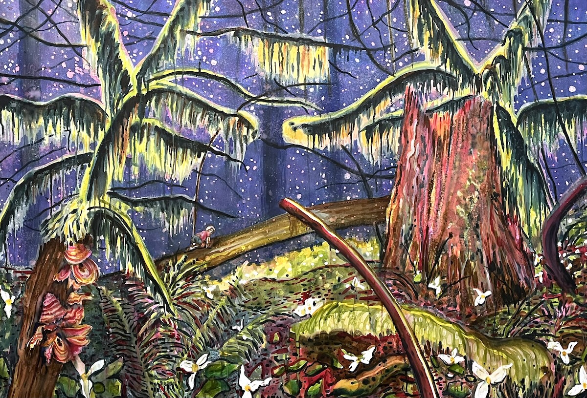 “In my most recent paintings, my depictions of nature acknowledge that mystery and nostalgia are tied to specific environments. The places I paint have been here before us, will remain after us, and they hold all sorts of secrets. The Pacific NW is special in that here the veil between the spiritual and physical world is thin. Mysterious as it is, the great outdoors has taken on an antidotal role to the general freneticism of life. Natural spaces serve as a healing escape, as well as a mirror to reflect our human emotions of fear, isolation, and bravery.”